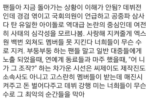 이 상태로 데뷔하면 욕이란 욕은 다 먹겠지 하지만 팬들이 실질적으로 해줄 수 있는 건 거의 없어 결국 차가운 시선을 받는건 엑스원 본인이야 자기 최애가 그런 시선 받으면서 활동해도 괜찮아? 지금 강행지지하는건 걍 자기 덕질 욕심 채우려는 걸로 밖에 안 보여