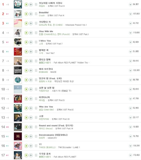 도깨비 당시 OST 순위 1, 2, 4, 5, 11, 12, 14...