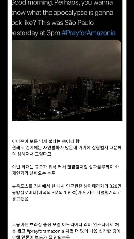 지구 산소 20%를 생산해내는 지구의 허파 아마존이 현재 인공적인 이유로 3주째 불타고 있는데 전혀 진화가 안되는 상황....