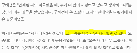 상대방의 언행과 눈빛에서 처음과 다름이 느껴질 때, 애정이 식었음이 확실해졌을 때 저런 인터뷰를 입밖으로 내뱉을 때 스스로가 비참하고 씁쓸하지 않았을까..