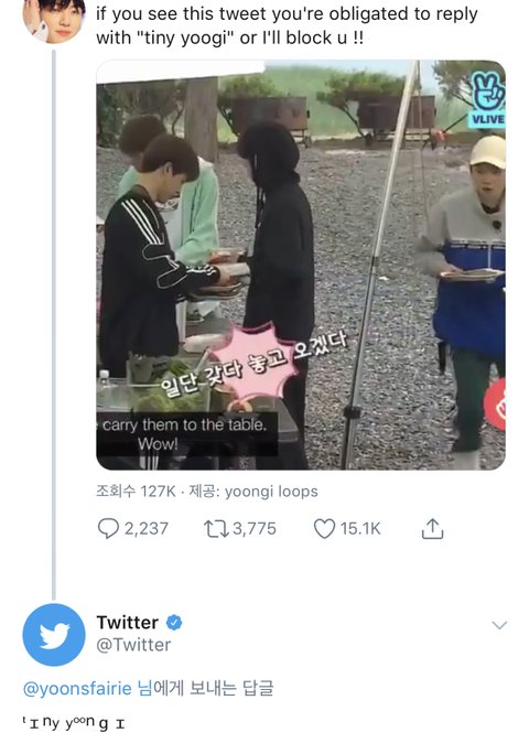 가끔 아미들 트윗에 답글로 주접떠는데 이번에돜ㅋㅋㅋㅋㅋㅋㅋㅋ Tiny yoongi 안써듀면 차단할거야 라고 한 트윗 찾아가서 굳이 ㅋㅋㅋㅋ