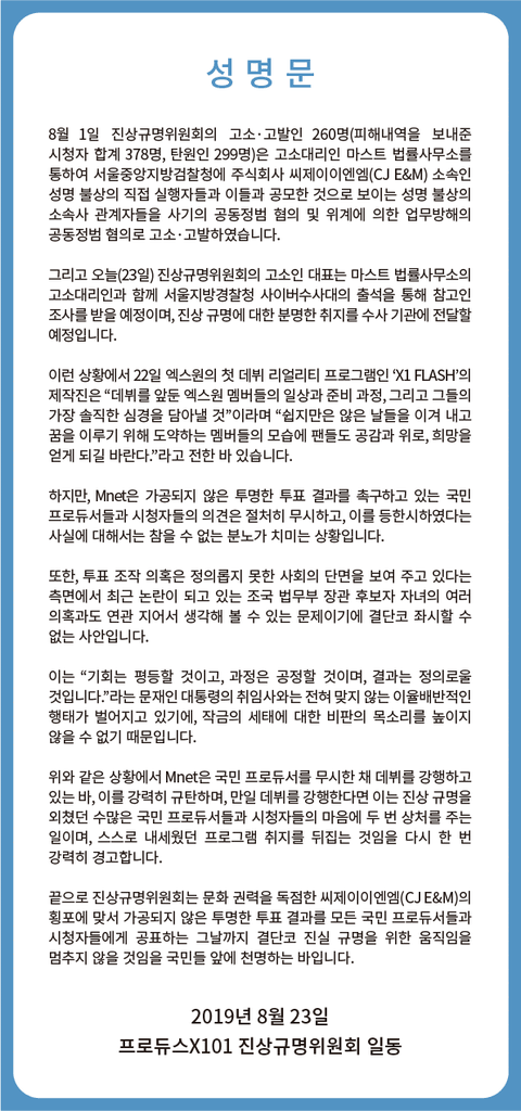 프듀 X 진상규명위원회 추가 성명문 발표