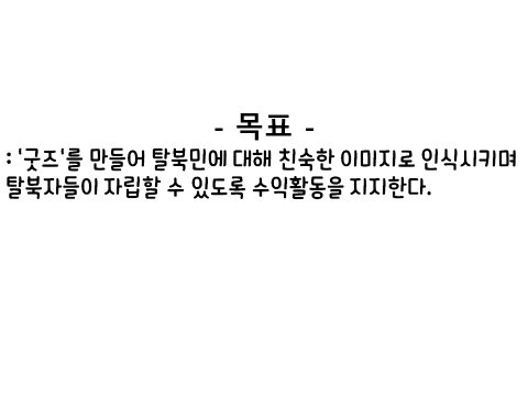 -목표: : '굿즈'를 만들어 탈북민에 대해 친숙한 이미지로 인식시키며 관심있는 탈북자들이 자립할 수 있고 수익활동을 할 수 있게 지지한다.