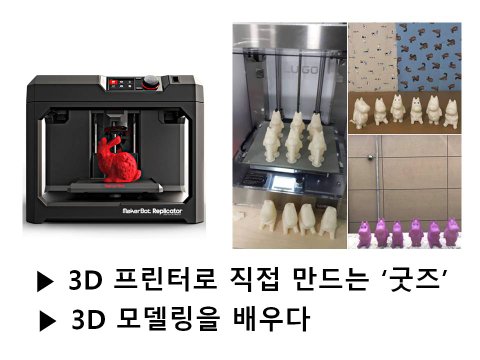 탈북청년들과 함께 3D 프린터를 통해 모델링을 배우고 led 결합 뱃지, 열쇠고리 굿즈를 만듦. 친숙하게 다가올 수 있는 '캐릭터'(이미지)를 같이 모색 해 보고 만들어 주변에 알리고 홍보함.