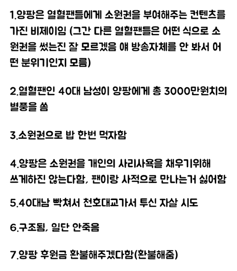 소원권이라는게 방송에서 먹방해주세요. 아님 제 이름 불러주세요. 이런거고, 애초에 개인적 만남안한다고 못 박아놓은거 40대 아저씨가 개진상 부리다가 안 통하니 지 성질에 못 이겨 자살소동