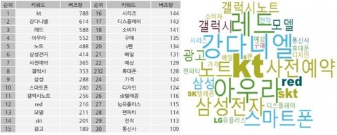 그림1은 조사기간 중 '갤럭시노트10'이 들어간 SNS 게시물에 자주 등장한 단어 순위를 버즈량과 함께 나타낸 것이다. 여기서 보듯 'KT', '강다니엘', '레드' 등 KT가 언급빈도에서 1위부터 3위까지를 모두 차지했다. KT는 갤럭시노트10 5G 전용 모델로 강다니엘을 내세웠으며 갤럭시노트10 전용 색상으로 '아우라 레드'를 선택했다. KT의 마케팅이 SNS에선 크게 성공한 것으로 드러난 셈이다.