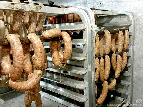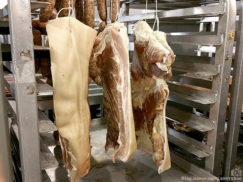 소시지 옆에는 염장 돼지 뱃살이 건조 중입니다. 이제 조금 지나면 껍질 벗기고 훈제 해서 베이컨이 될 운명이지요.