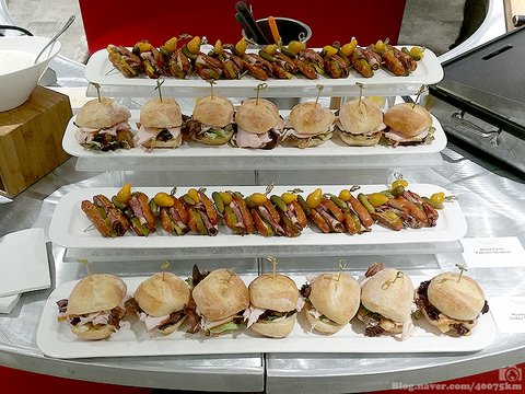 핫도그 스테이션은 물론이고 주문 받으면 그 자리에서 만들어 주는 파스타 스테이션, 행사장 뒷편 주방에서 바로 만드는 각종 튀김류, 직접 한 조각씩 썰어주는 뜨거운 고기류도 있습니다.