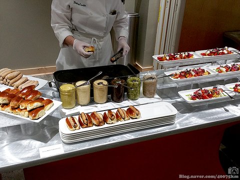 직접 만든 소시지에 직접 만든 각종 소스와 피클을 곁들여 제공하는 핫도그 스테이션.