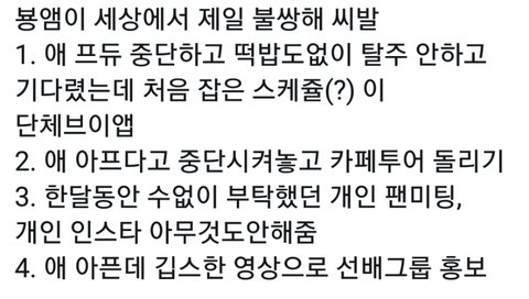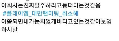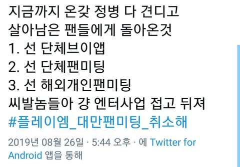 제목의 주인공은 바로 플레이엠..^^ 이번에 병찬이 개인팬미팅을 홍콩에서 한다지 뭐예요!!^^ 심지어 한국에서 하는 단체 팬밑보다 좌석많음 우리가 한국단체팬밑 좌석 적다고(1000석도 안됨) 총공도 돌리고 전화도 하고 메일도 보냈는데 돌아오는 결과는 눈막귀막..^^ 그렇게 또 참아줬는데 이번에는 홍콩개인팬밑 이번이 처음이 아님 우리 공식색표절당했을 때도 ㅈㄴ 가만히 있고 프듀 끝나고 한 첫 스케줄?이 단체 뷔앱.. 일도 ㅈ도 안 하고 컴백 감감무소식이고 애 다친것도 선배그룹노래 홍보영상에서 봐야되고 ㄹㅇ 소속사가 우리한테 해준건 탈주독려.. 돈벌기싫은듯한 태도 .. 아니 ㅅㅂ 심지어 단체팬밑 좌석수 적어서 팬들끼리 돈모아서 팬밑장소 대여해준다는 말까지 나왔는데 묵묵부답~ 전화 안 받고 메일 안 읽고 총공 눈막귀막~