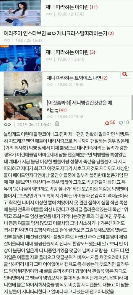 헐 남돌팬인데 댓글 죤.나 공감 빅뱅팬들도 저러고 다녔는데 내가 본것만 동방 슈주 비스트 방탄 등등