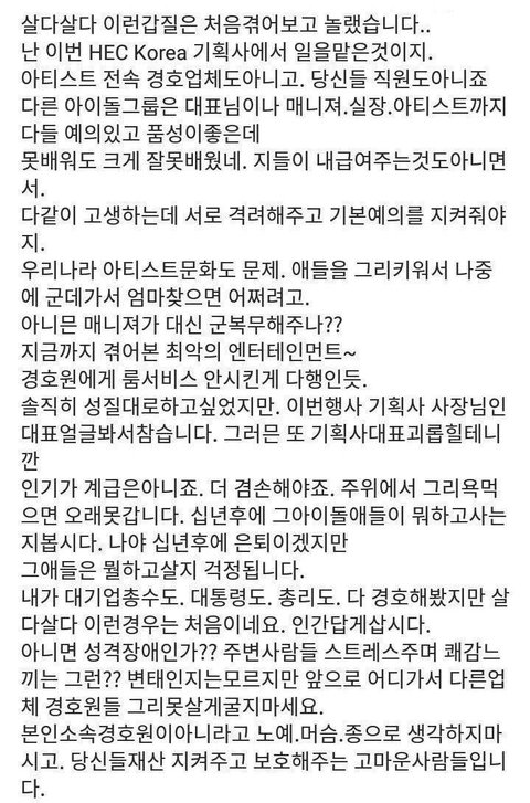 저기 참석한 타 아이돌그룹은 대표 매니저 실장 아티스트까지 예의있고 품성이 좋았다는 서두만 봐도 그냥 저 그룹만 전부 문제였나보네 마지막에 10년뒤 그 아이돌 뭐하고 사나 보자는거보면 아이돌도 싸가지 없기는 마찬가지였겠지 대충 무슨 그룹인지 알겠다 범위도 좁고 유명돌이라면 뻔하잖아