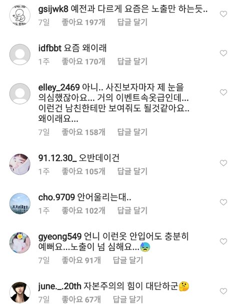 나 가슴 자연 h컵에 다리예쁘단 소리많이 듣는데.. 나같은 몸매는 다들 첨이라 그래 근데진짜 몸매 좋은 애들은 저런사진 안 올림 매일 듣는 말이고 가만히 있어도 관심받는데멀 난그냥 티만 입어도 우와하는데.. 어중간 애들이 원래 그럼 그냥 그런가보다 하면 될일 욕하는건 아닌듯 근데쟤도 저런거 올려놓고 성적으로 디엠받아서 슬프다 억울하다 기분나쁘다 이런건 아니지 본인이 자초한 일인데