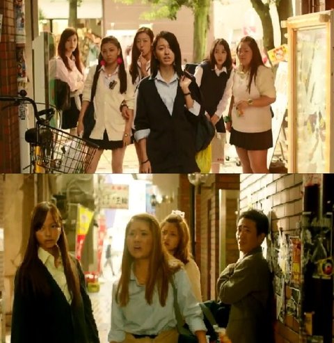 한국판은 운동권 학생들과 진압하는 인원들이 뒤섞여 소녀시대와 격투를 벌인다.