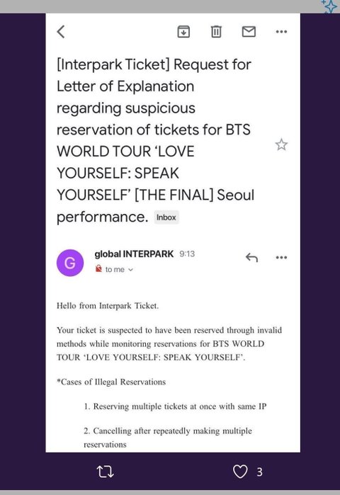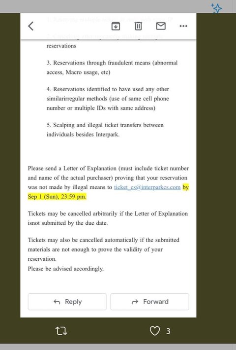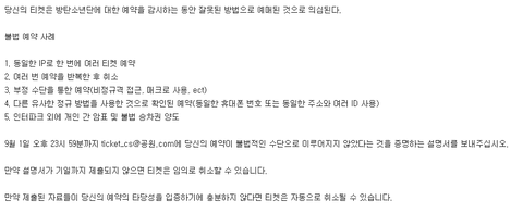 9/1까지 불법적인 예매가 아니라는 증명을 하라고 메일 왔대 ㅋㅋㅋㅋ 증명 하지 모다면 취소된다는 내용 ㅋㅋㅋㅋㅋㅋ ㅊㅊ 양1양님 짹
