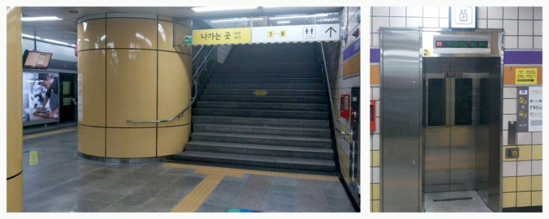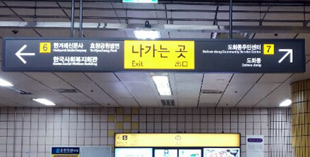 Exit numbers are shown on yellow squares on directional overhead signs at the concourse. When you come, you will meet the stairs.