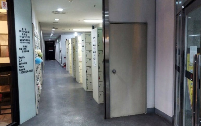 And walk straight past all the lockers. At the end of this passageway, there is a metal door to the right. Open this door (as it usually remains shut) and you will reach the elevators which goes up to our house.