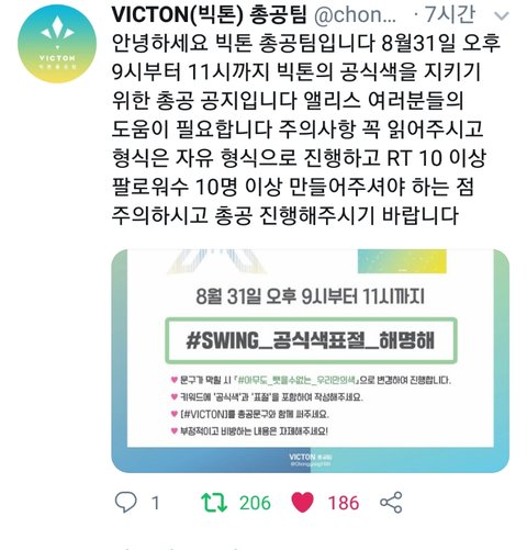 공식색때문에 오늘 실트총공이 있어 물론 우리는 피해입는 거 없으니까 안 해야지 이런 사람들도 있을건데 공식색문제는 두 팬덤의 문제야 두 팬덤 모두 피해가 가 엓원이 표절돌로 불리거나 그러면 너희도 안 좋잖아 그리고 만약에라도 연말무대 때 승우가 원잇~ 이러고 갔는데 앨리스면? 우리 정말 같이 바꿔야돼 그리고 뭐 앨리스가 양보해라? 뭐 이런 글도 있던데 정말 공식색은 빅톤이랑 3년을 같이한 소중한 색이야 정말 양보라니 너무 기막히다 제발 우리 오늘 실트총공 같이하자 같이해서 꼭 스윙이 바꿔주길 바라자.. 두 팬덤 같이 해야 돼 엓원 팬들한테 많이 퍼트려줘ㅜ