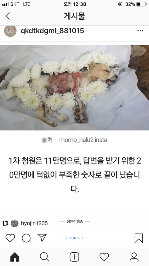 여러분 https://www1.president.go.kr/petitions/581816 강아지 전신화상 학대사건에 서명부탁드립니다.. 작디작은 3개월짜리 강아지가 뜨거운물과 담뱃불에 학대를 당하고 쓰레기봉투에 담겨 살겠다고 발버둥치다가 세상을 떠났어요.. 청원이 2일남았는데 너무 저조합니다.. 범인을 잡아서 다시는 동물학대할수없도록 서명부탁드려요 ㅠㅠ