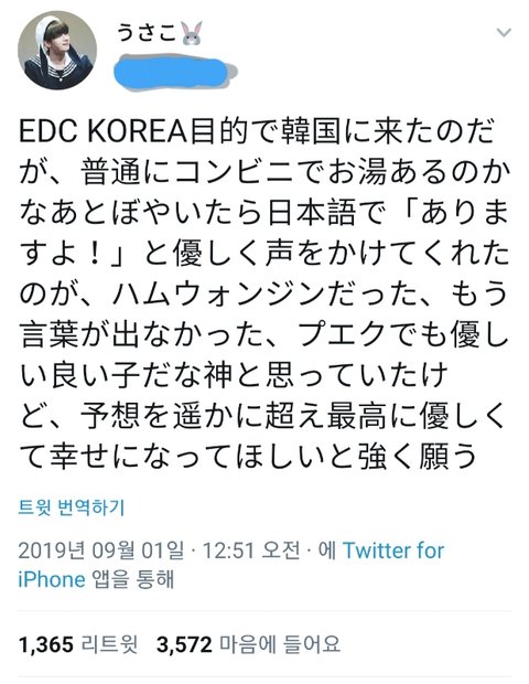 "EDC KOREA 목적으로 한국에 왔는데, 보통 편의점에서 뜨거운 물이 있는 걸까라고 투덜대니까 일본어로 " 있어요!"라고 다정하게 말해 준 것이 함원진이었다. 다른 말이 나오지 않았다. 프엑에서도 착한 아이구나라고 생각했는데, 예상을 훨씬 넘어서 최고로 자상하고 행복해지길 간절히 원한다."