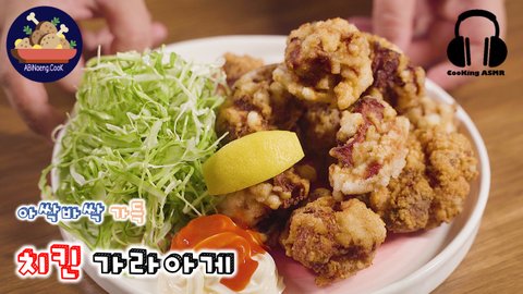 닭은 튀겨야 제맛이죠??!!! 저는 닭다리살만 사서 치킨 가라아게 만들어 튀겨 먹기도 하는데 치킨 가라아게는 밑간을 해서 튀기는 거라서 짭조름하니 맛있기 때문에 아이들도 좋아하는 간식이고 어른들에게는 시원한 맥주와 함께 즐길 수 있는 안주가 되기도 합니다. 이번 영상은 감자전분으로 구슬 튀김 옷을 만들어 튀기는 업소 이자카야 비밀 레시피 입니다. 감자전분 구슬 튀김 옷 때문에 더욱 바삭하고 아삭한 치킨 가라아게를 맛 보시실 수 있습니다. [재료] 닭다리살 400g 갈은 마늘 15g 진간장 30g 굴소스 20g 정종 30g 후추 조금 계란 반개 감자전분 40g 양배추 -감자전분 구슬 튀김 옷 감자전분 100g 물 50g [조리과정] 1. 닭다리살은 한입 크기로 자릅니다. 2. 갈은 마늘, 진간장, 굴소스, 정종, 후추로 간을 하고 30분 이상 마리네이드 합니다. (이 과정을 좀 소홀히 하게 되면 잡내 제거도 살짝은 미흡하고 먹었을 때 짭조롬한맛이 좀 덜합니다.) 3. 물을 감자전분에 4~5회 나누어 부으면서 전분을 비비면서 구슬 모양으로 만듭니다. 4. 양배추는 얇게 슬라이스 해서 가니쉬로 준비합니다. 5. 계란을 풀어서 반을 2의 마리네이드 한 닭다리살에 넣고 (계란 한 개를 다 넣으면 너무 질게 되어 구슬 튀김 옷이 풀어 집니다.) 6. 감자전분을 섞어 반죽합니다. 7. 6의 닭다리살을 3의 감자전분 구술 튀김옷에 묻혀 튀깁니다. 8. 건졌다가 3~5분 후 한번 더 튀겨줍니다.