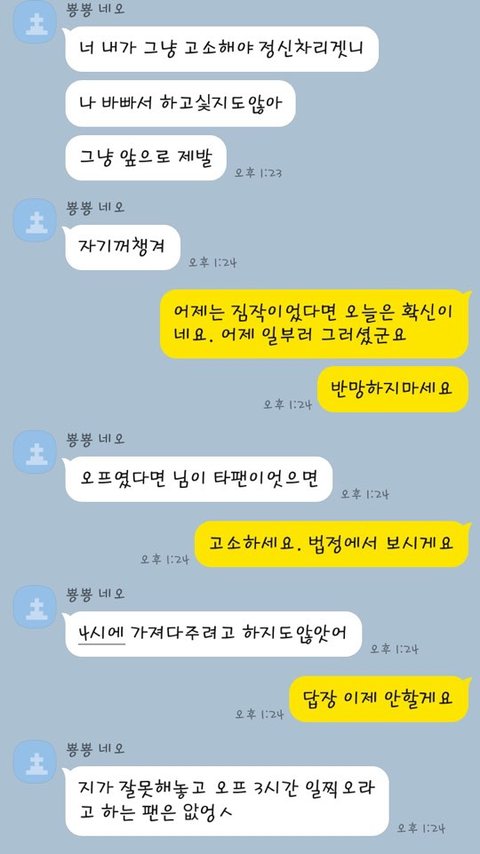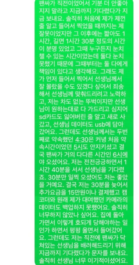 반납시간이 초과되면 대여업체에서도 뒤의 예약때문에 곤란하고, 하루치 대여비를 더 내야하는 상황이었던 저는 최대한 그분께 맞춰드리려 제 캠코더 백업도 미루고, USB에 그분의 촬영분을 담아갈테니 제발 약속시간까지 나와달라고 말씀드렸지만 그분은 차피 자기는 팬싸준비때문에 그 시간까지 맞춰갈 수 없다는 입장을 내놓으셨습니다.