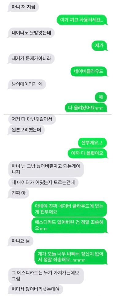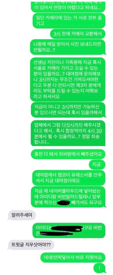 이런 사건으로 정신이 없던 저는 이때 제 주머니에 그분의 메모리카드가 들어있는 줄 알았고(사실 카메라 안에 들어있었습니다...), 주머니에 메모리카드가 없자 대여점에서 메모리카드를 새로 구입하고 그분께 죄송하다는 말씀과, 메모리카드를 새로 샀으니 포맷해서 사용하시고, 데이터는 네이버클라우드에 모두 백업해놓았으니 걱정하시지 않으셔도 된다고, 제 아이디와 비번을 알려드릴테니 네이버클라우드에 들어가 촬영분을 빼가시면 된다고 말씀을 드렸으나 그분은 절 믿지 못하셨고 3시쯤에 갑자기 절 믿지 못해서 네이버클라우드에서 본인의 데이터를 다운받고 가야겠다고 약속시간이었던 4시 30분까지 오지 않겠다고 말씀하셨습니다.