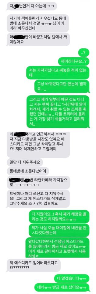 저는 그제 어떤 가수의 팬사인회에서 카메라가 바뀌었고 그 일을 해결하기 위해 어제 하루종일 고생했습니다. 그러나 집에 와서 가족들과 얘기를 해보니 부모님께서는 딸이 이런 일을 겪었다는 것에 매우 격분하셨고, 제가 겪은 일을 그 가수의 갤러리에 올려서 다른 사람들도 알게 해야 한다고 하셨습니다.