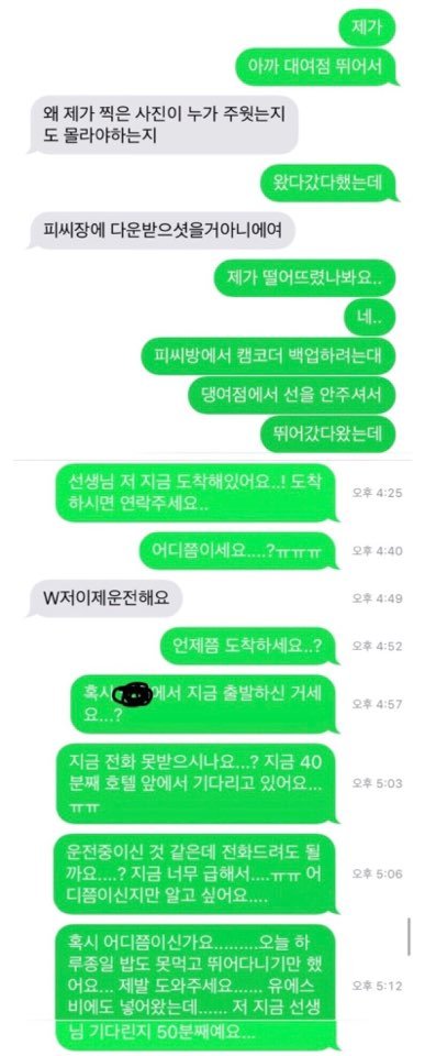 초조해진 저는 계속 전화를 걸었지만 연락이 되지 않았습니다. 그러더니 4시 50분에 이제 운전하신다는 문자를 받았습니다. 저는 그 문자를 받고 지금 집에서 출발하신다는 건지 주변에서 출발하신다는 건지 몰라 계속 연락을 드렸으나 받지 않으셨습니다.