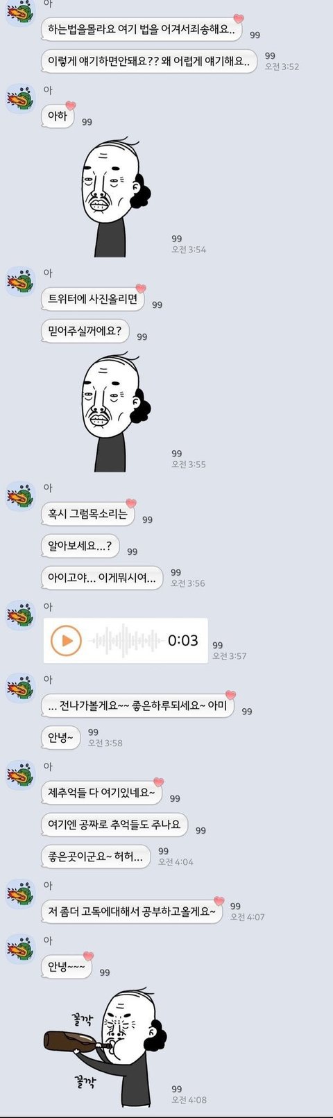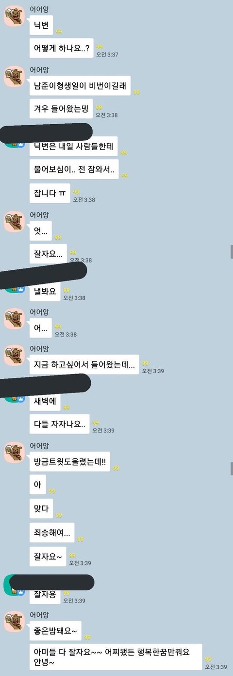 그 후 다른 고독방이었나? 들어가서 자기소개 하고 들어감 ㅋㅋㅋㅋㅋ 닉변해달니까 닉변이 모애오? 저 아미 암것도 모르고 잔다고 ㅠㅠㅠㅠ 와기 당황 ㅠㅠㅠㅠㅋㅋㅋㅋㅋㅋㅋ ㅠㅠㅠㅠ 새벽에 다들 자자나요라니 ㅠㅠㅠㅠㅠㅠ