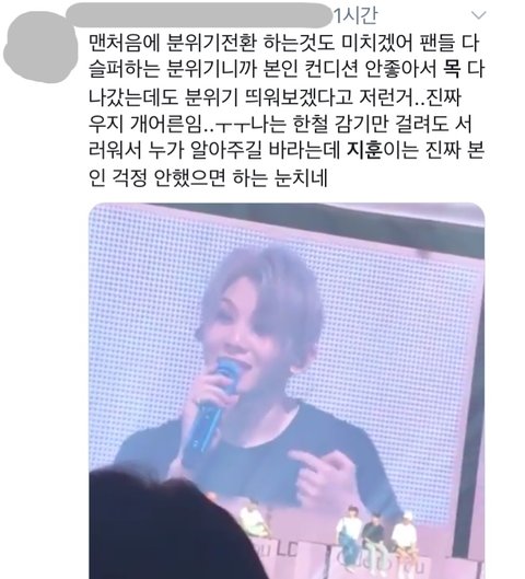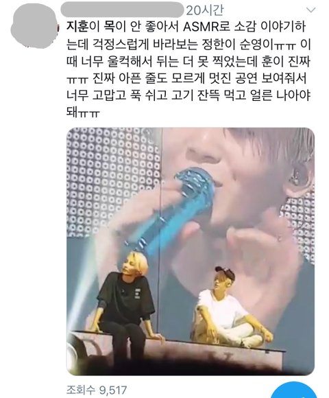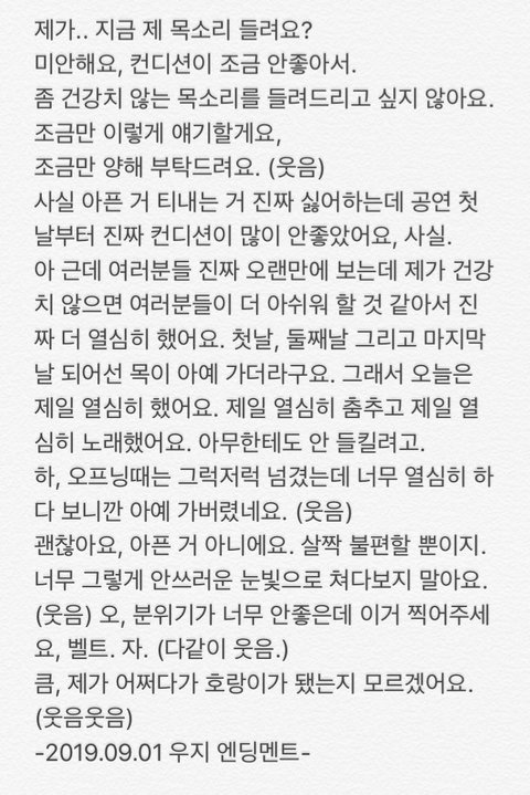 위에 트윗글도 그렇고 우지 말에 의하면 콘서트 첫날부터 목이 좋지 않았다고 함.