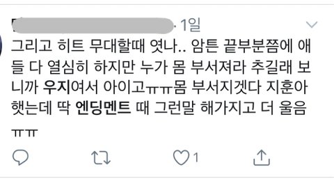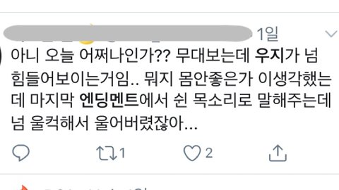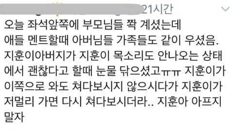 그리고 그때 세븐틴 부모님들도 다 오셨는데 우지가 엔딩 멘트하면서 안 나오는 목소리로 저 괜찮아요 할 때 우지 아버님이랑 다른 부모님들도 다 눈물 흘리셨대.