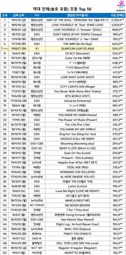 오늘 갱신된 아이돌 초동순위
