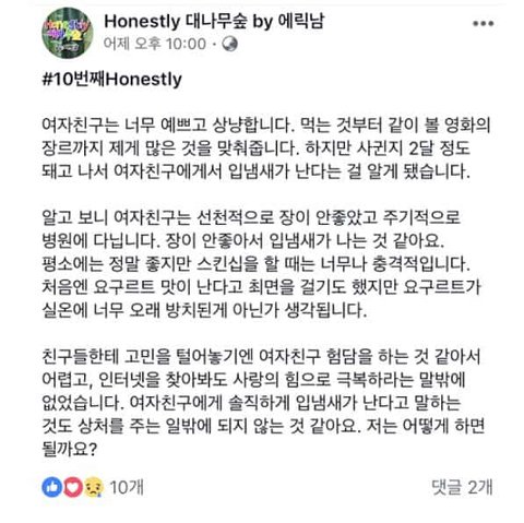 나도 장이 별로 안좋아서 입냄새 나는편인데, 껌 자주 씹거나 입에 뿌리는거 칙뿌리거나 하면서 엄청 신경쓴다. 내가 은근 알고 있었지 그렇게 심한지 몰랐는데, 한번 신경쓰니까 이 닦고 얼마 안있으면 냄새가 나는거 확실히 알겠더라.. 진짜 스트레스 엄청 받았어. 진짜 이를 오래 박박(?) 닦아도 냄새나 ㅋ 언제부터 신경썼냐면, 한번은 구남자친구가 뽀뽀를 하기전에 엄청 달달한맛 껌을 먹으면서 하자거나, 사탕 먹게 하거나 등등 방법을 계속 쓰더라고. 나는 자고 일어나서도 입에서 건강한 냄새나는 사람 너무 부러워.