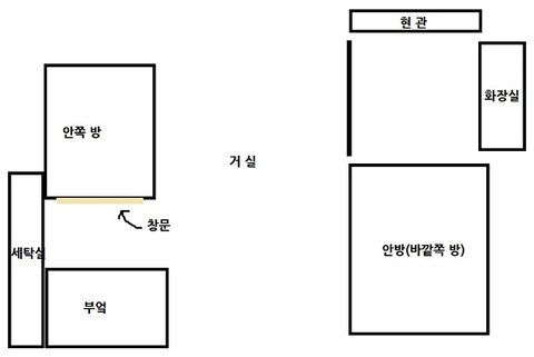 그리고 안쪽 방이랑 부엌이 같은 방향에 있고,부엌 뒤로 안쪽 방에 있는 작은 창이 바로 이어져 있거든요.