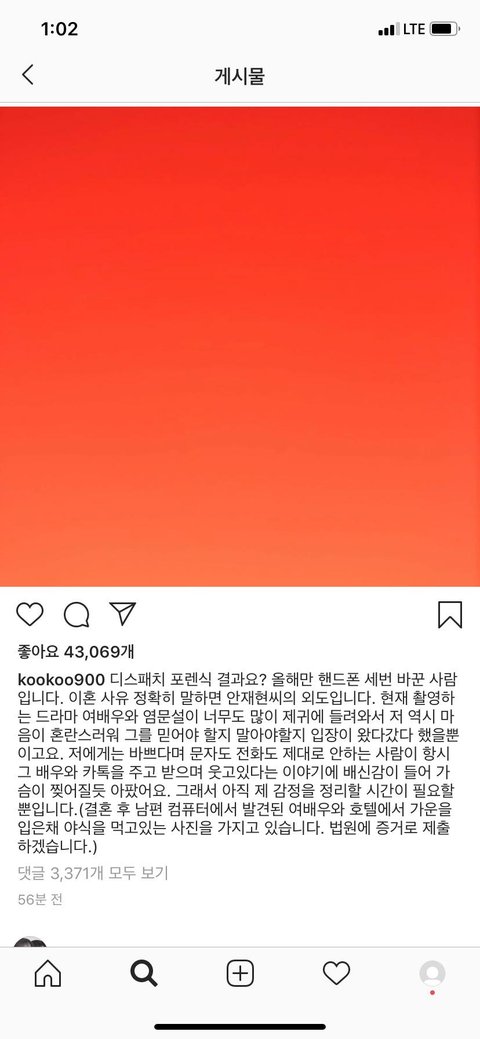 저 호텔에서 여배우 사진도. 신혼일기 방송에서 얘기했던거래. 결혼 전 전 여친 사진 본거 그거가지고 저러는거 같음. 이제 좀 이상해 보여