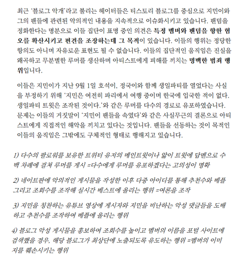 저 엔터 댓글에 지민앰 아니라고 인증해줘도 저들은 안들어 6방탄이라고 하면서 조작으로 치부하고 본인들과 반대되면 무조건 지민앰이라고 몰아가더라 한명 죽이기가 그게 어떻게 팬이야 팬 아니지 인증도 못해서 도용해 공카로 인증해달라고 하고 그러고 있어 이글도 문제되면 삭제할께 참고로 나 쓰니 아니야