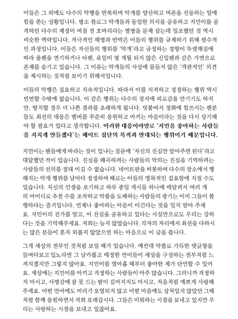 베댓 웃긴다 [쟤네 말이 맞는 것 같다 생각하는 순간 “아 나는 악개구나”]ㅋㅋㅋ 말이 맞으면 맞는거지 그걸 왜 악개로 몰아가? 원래 가해자들이 피코하면서 저런말 하던데 ㅋㅋㅋㅋ 악개는 지민팬들이잖아 니들이 악개소리 안 듣고 싶으면 니들 잘못한거 사과부터 해 ㅋㅋ 니들 잘못 항의하는 사람들 보고 악개로 몰아가지 말고 ㅋ