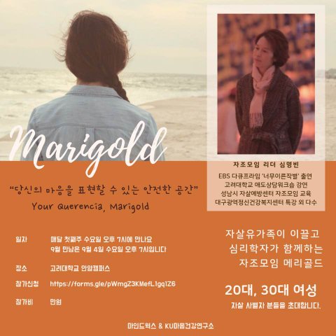 안녕하세요? 고려대학교 심리학과 부설연구소인 'KU 마음건강연구소'에서자살유가족이 이끌고 심리학자가 함께하는 자조모임 [메리골드]를 함께하실 자살사별자 분들을 모십니다.