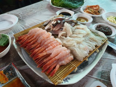마지막으로 엊그제 엄마생신에 차려드렸던 회 3종세트에요(회랑 전어는 필렛으로 받아서 썰고, 단새우도 껍질까고 냉수마찰 시켜서 회로 잘 먹었어요 ㅎ)