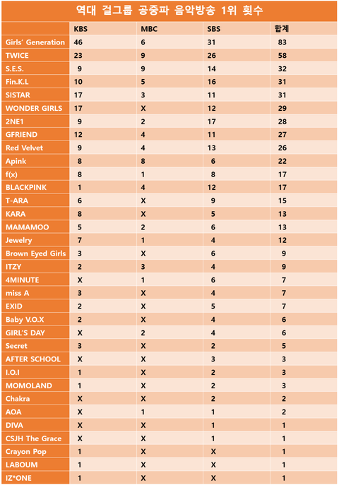 역대 걸그룹 공중파 1위 횟수