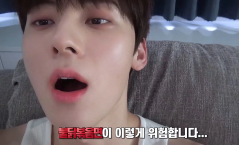 불닭볶음면을 먹고 매운걸 참는 황민현을 봅니다
