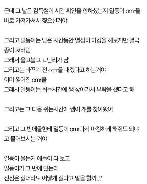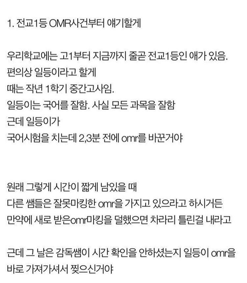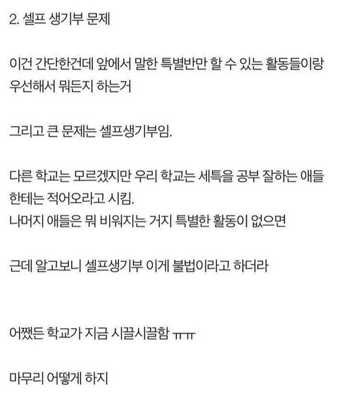 생기부 셀프 당연히 하면안되는건데 요즘 대학보낸다고 다 난리라 하는애들많아서 당연하게 생각하네..ㅋㅋ 원래 졸업전까지 우리학교는 담임이 써준 사항은 절대 못보게 칼로 오려내고 학교활동중에 자신이한 활동맞는지만 확인하게해줬는데;