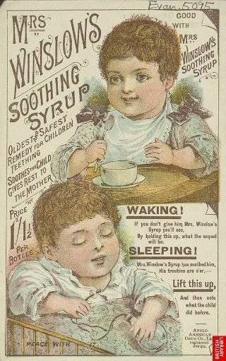 윈슬로 부인이 원래 간호사였는 데 손자가 젖니때문에 아파해서 간호사로 활동하면서 얻은 지식과 오랫동안 연구해서 만든 게 저 진정시럽임. 저 진정시럽은 아이들한테만 먹였던 게 아니고 전쟁 당시에 부상을 당한 병사들의 진통제로도 썼음. 저걸 먹으면 아무일 없었다는 듯 아픈 게 사라져서 저 당시에 진정시럽 재고가 들어오면 바로 품절될정 정도로 인기가 엄청 나게 많았음