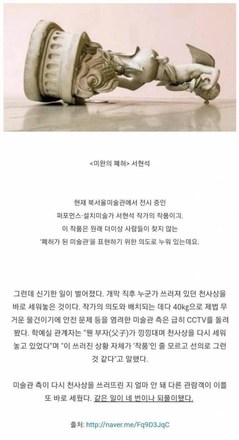 ㅋㅋㅋㅋㅋㅋㅋㅋㅋ 긔엽ㅋㅋㅋ 그런데 미술관에서 작품이 넘어져있어도 함부로 손대면 위험할듯.. 관리자를 부릅시다
