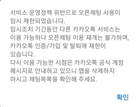 카카오톡 오픈채팅방사용이 임시 제한 됐는데, 보통 제한되고 몇 시간 뒤나 하루 뒤에 카카오톡 측에서 제한 사유, 기간 등을 공지하는 톡이 옴.