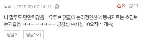 유튜브 댓글에 논리정연한척 똥싸지르는 초딩보는거같음 ㅋㅋㅋㅋㅋㅋㅋㅋ 수치심 10오지네 개쪽;