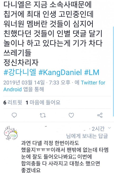 강다니엘이 소속사 뛰쳐나간 시기에 워너원 다른 멤버들이 자신 개인 인스타로 서로 댓글 달면서 놀았다고 강다니엘팬들이 워너원멤버들 ㅆㄹㄱ라 욕하면서 머리채잡음