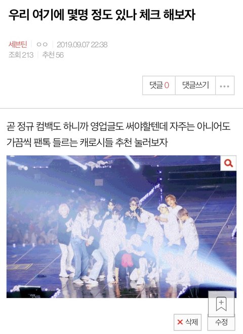 여튼 일주일 후면 정규 컴백인데 혹시 전에 영업글 써주던 캐로시 아직 여기 있니.....?! 없다면 총대 메줄 캐로시도 필요할 거 같고 지금부터 슬슬 내용 구상 시작해보는 거 어떨까 곧 자정에 트랙리스트 뜨니까!