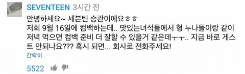 그리고 승관이가 '세븐틴' 공식 유튜브 계정으로 댓글을 남겼음